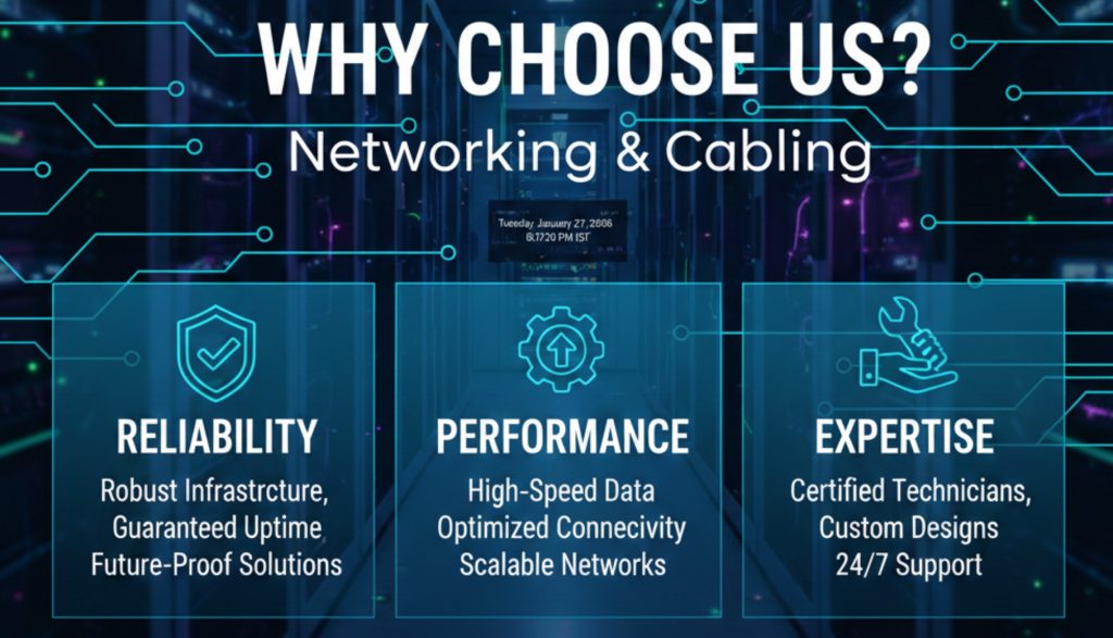 A strong network foundation is critical for business operations, communication, and security. Our Networking & Cabling services deliver high-performance, reliable, and scalable network infrastructure for offices, commercial buildings, and new construction projects.